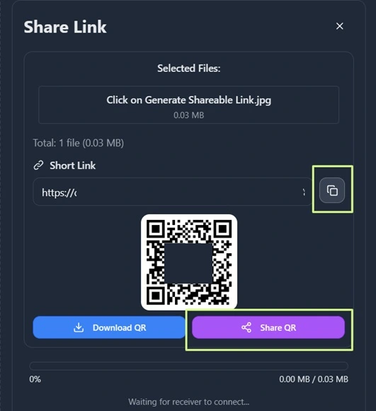 Step 3: Then use the Link, or QR to Start the File Transfer. You can Share the Link using Whatsapp Web/Email or manually Type in your Browser.