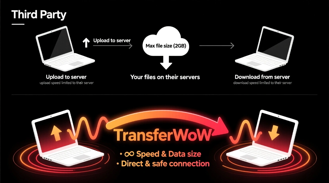 While cloud and Bluetooth are fine for small files, TransferWow.com delivers the fastest, safest, and most effortless way to transfer files from any device to any device: free, unlimited, and peer-to-peer.