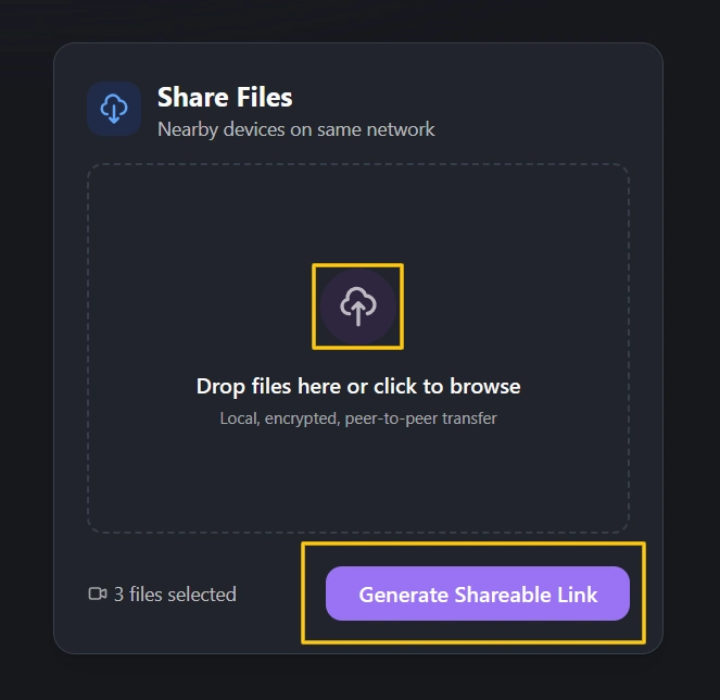 Step 2: Then Drop or Select your File/Files that you want to send your Laptop and Click on Generate Shareable Link Button
